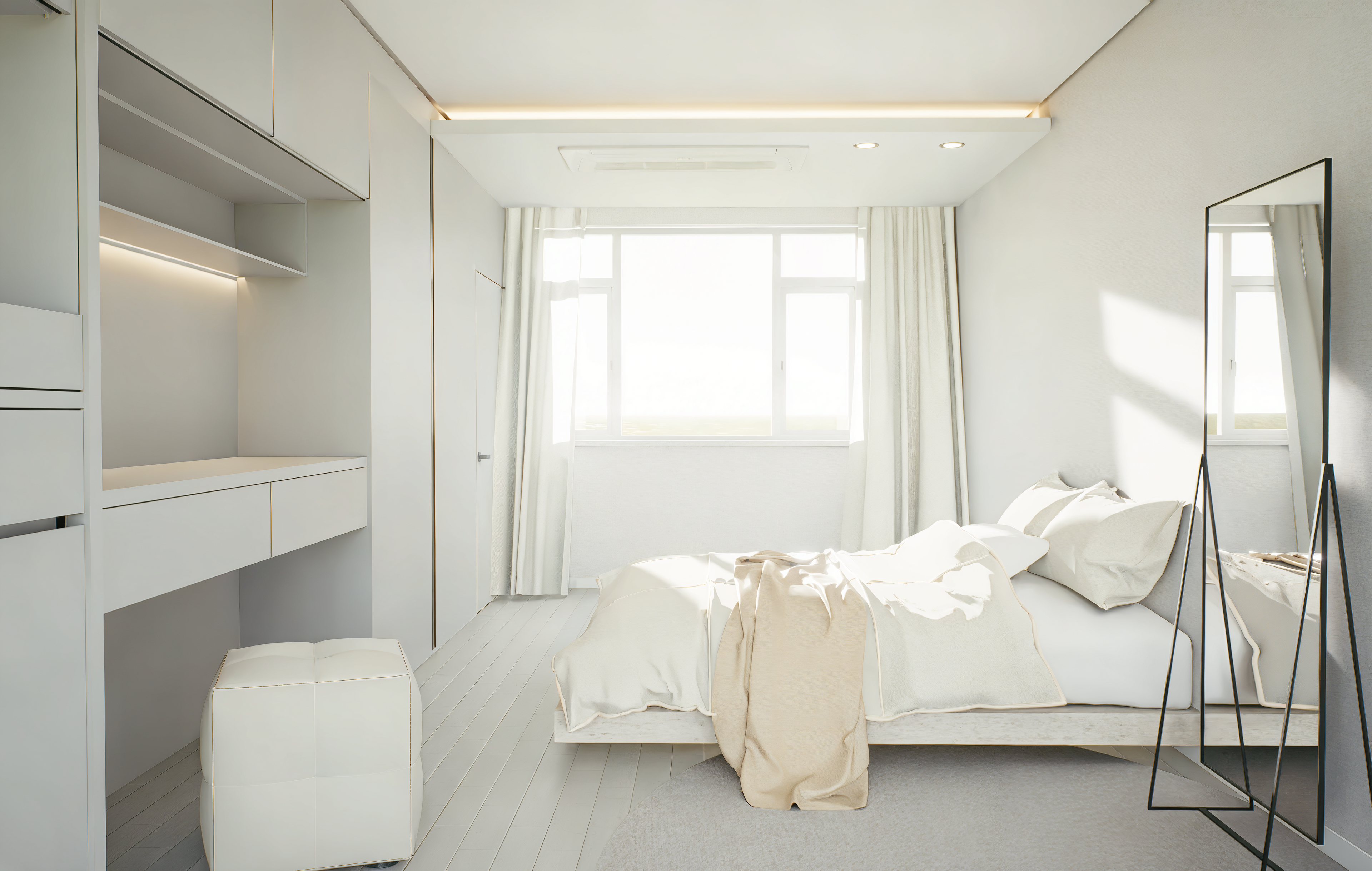 이번에도 아주 흔하게 볼 수 있는 원룸을 가지고 왔습니다. 저번과 다를 게 없는 화이트 톤에 깔끔한 공간입니다. 그러면 바이오필릭 핵심 중 가장 쉽고 편하게 할 수 있는 "자연광"을 먼저 이용해 보겠습니다.